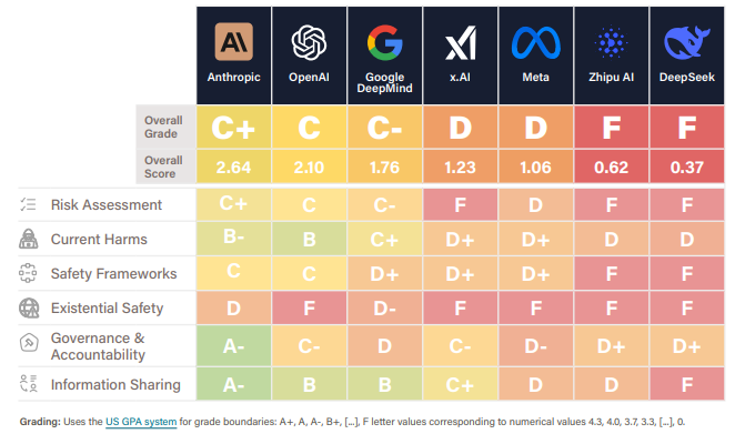.- Una comparativa de distintos elementos de cumplimiento en materia de IA que nos hemos encontrado por los mares de internet, vía Future o Life Institute,y que no está mal como lectura de visión general de que todas la grandes rascan en algo. Aunque muchas valoraciones sobre tema de compliance y Governance se hacen mirando si tiene los docs correspondiente publicados, y no tanto en el contenido de los mismos. Para sorpresa de nadie, lo más de China rasca más.