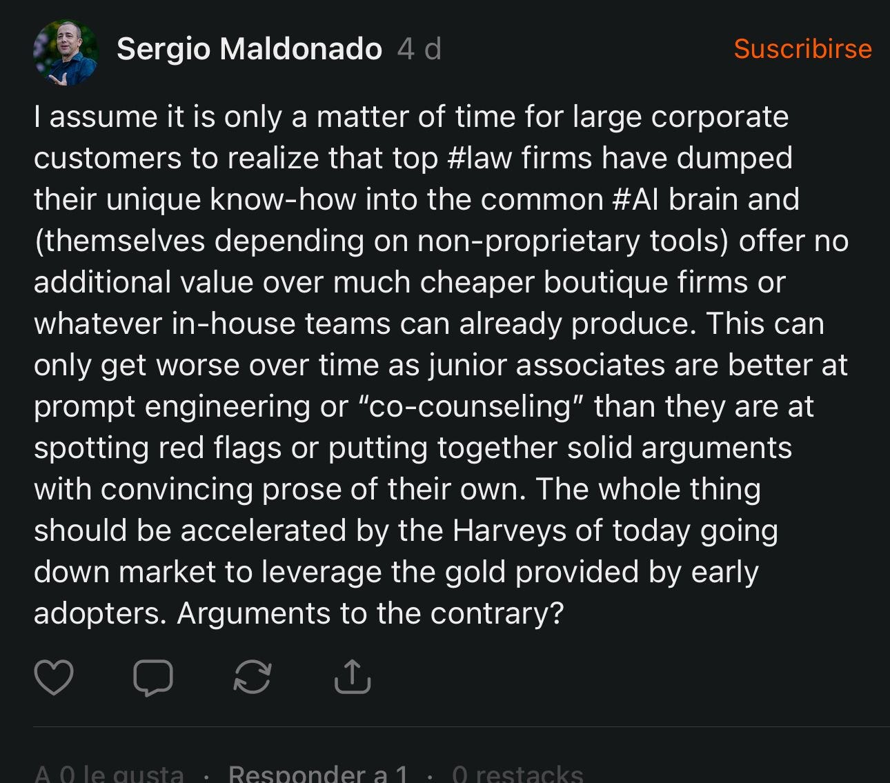 2.- All of us small firms are delighted with AI. And you already know, if you look like an early adopter, it’s exhausting: when it seemed like you had finished taking care of your clients, you have to take care of your own curiosisty and spend a couple more hours experimenting with each new iteration and big idea from BigTech.