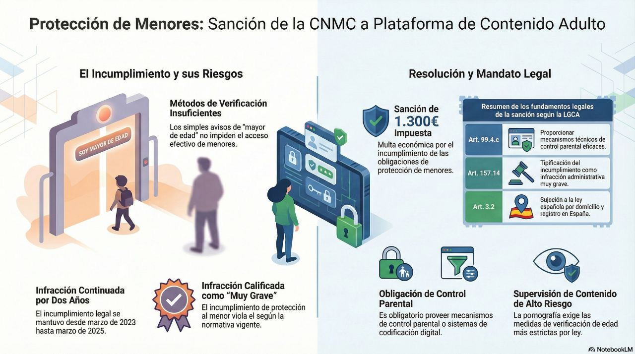 .- Una de las primeras sanciones que vemos por no tener un sistema de verificación implantado en páginas de contenido luminoso. Una sanción de la CNMC enana de 1.300 con infracción continuada, pero aquí está. Vía Ramón Arnó. Le cogemos prestado la infografía maravillosa generada para explicarlo en LinkedIn: