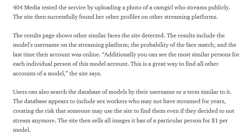 Primero.- Empezaré con un ejemplo práctico de los que me gustan a mí. Precisamente 404 denunciaba esta misma semana “Camgirlfinder” un servicio de reconocimiento facial especializado en fíjense, recibir de las joyas de sus usuarios imágenes y vídeos de “cam-girls” -también identifica a los tíos- que hubieran decidido impedir o dificultar su identificación con máscaras, velos o lo que se les haya ocurrido, y aprovechando la tecnología punta para los usos más bajos posibles, identificarlas.