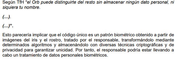 Les piden reunión para el 3 o 4 del mes que viene, pero la AEPD les va comentando cosas de lo que parece que les han enviado, en forma de advertencia (incluye el texto de comunicación de los señores del orbe). La primera es que eso de intentar jugar a escaparse del 9, como que aquí no es muy creíble. Muy iris, mucho iris para . El matiz de que la finalidad no es la identificación unívoca está de moda con la estimación facial de verificación de edad, pero aquí es más chungo intentarla.