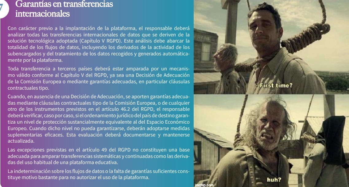 .- No es tan cafetero, pero puede encajar por la resolución enlazada. Casi a renglón seguido de la sanción a colegio madrileño por liarla con Google Workspace, las cuatro autoridades de protección de datos han sacado guía sobre contratación y uso de plataformas digitales. Dice lo que tiene que decir, pero la realidad nos coloca a los de siempre en la soga. Puede que no te ponga delante un 49, pero ¿y un DPF que para nada sirve en la sucesivas que todas sabemos que existen, o ¿hay algún servicio viable por tamaño que te pueda asegurar que cumple como palabra de Scout en transferencias?.