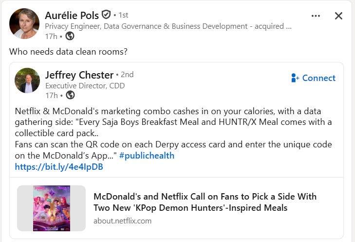 Partiendo de esta captura del atinado comentario de Aurelie Pols de que tendría sentido una buena data clean room, nos ha dado por ir a mirar un poco la campaña para empezar esta newsletter de otra manera. Foto fija del tiempo actual.