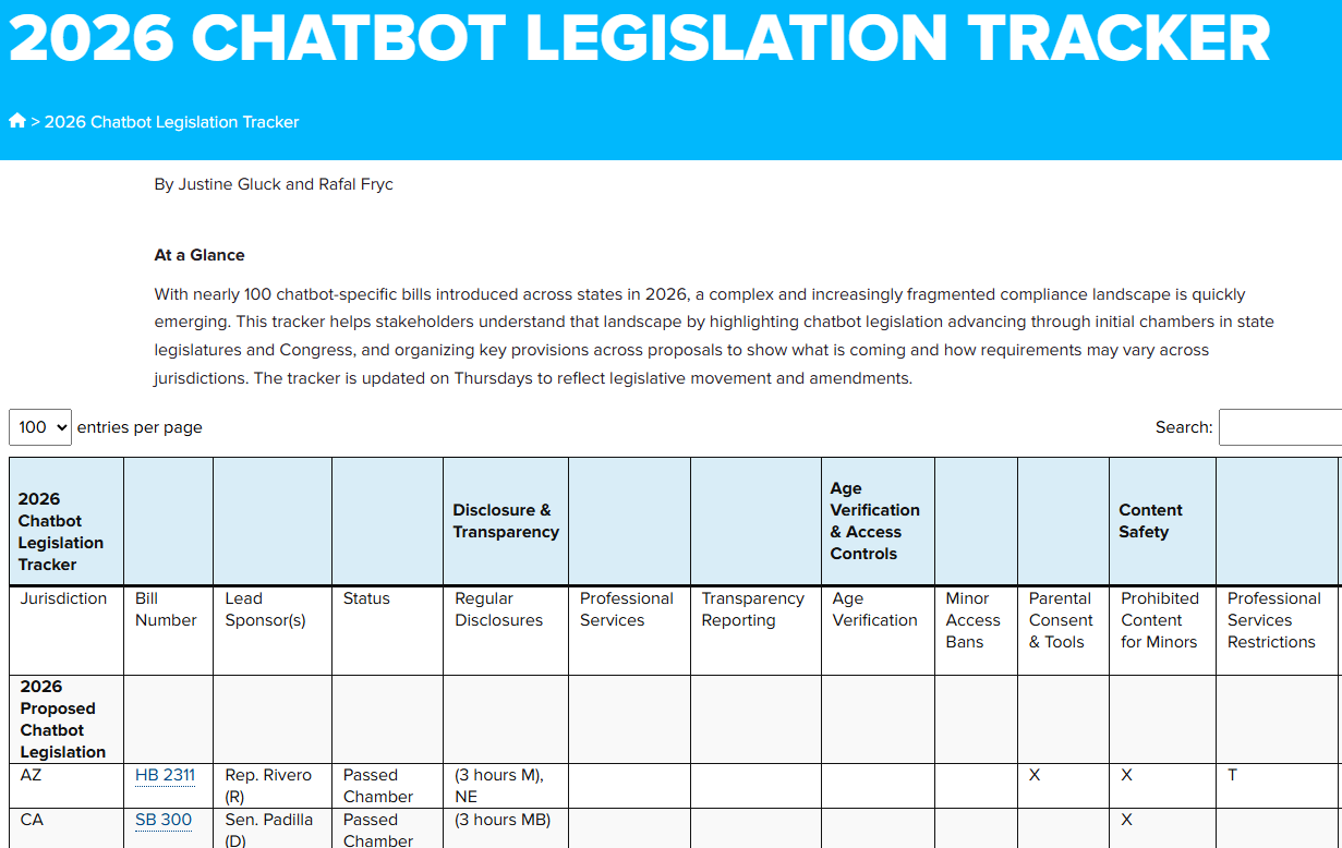 .-Siempre nos queda muy lejos la normativa de los States de USA, pero siempre van saliendo recopilaciones y herramientas de visualización tipo IAPP. Ahora se suma un tracker sobre la incipiente normativa de Chatbots (seguro que también de agentes) de los estados que están en ello, vía FPF (Future of Privacy Forum).
