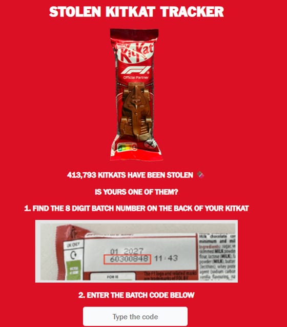 Puede parece algo nada relacionado. Para el que no se haya enterado, a Nestlé le mangaron un camión (y su contenido en forma de 400.000 barritas tipo F1) en un trayecto entre Italia y Polonia. Obviando que el conductor tiene que estar en el ajo para que no haya geolocalizado el camión que, seguro, llevaba baliza, a Nestlé se le ocurrió lanzar esta landing page buscando la colaboración ciudadana. De tener chocolate con el código afectado, se supone que te daba indicaciones para ponerle en conocimiento de la empresa y las autoridades con las que están colaborando.