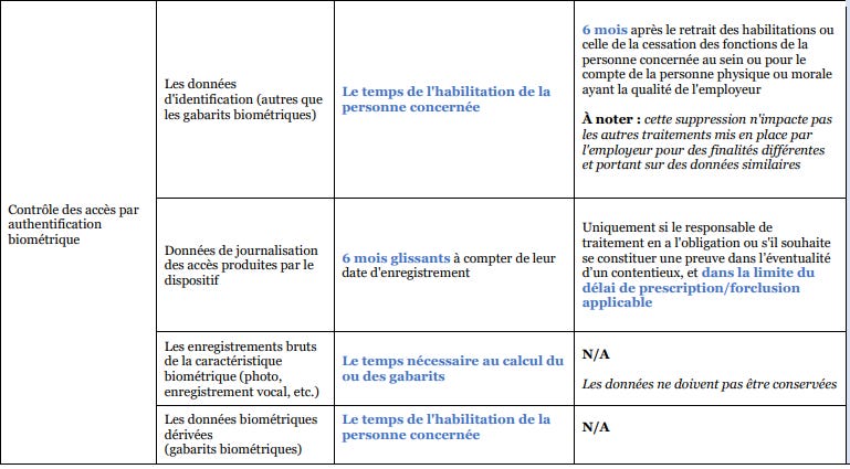 .- La CNIL publica documento sobre plazos de conservación el ámbito laboral. Muy en formato de cuadro, y sin muchas sorpresas. Lo que llaman plazo de archivo intermedio, no deja de ser lo mismo que nuestra especialidad del 32 de la LOPDgdd sobre bloqueo. Incluyen detalle del acceso por medio biométrico, y hasta desglose de la misma plantilla.