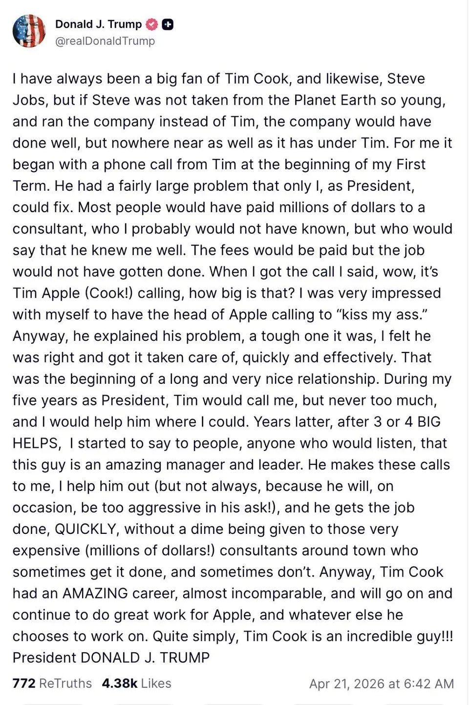 .- Tim Cook cesará como CEO de Apple y TACO Trump le ha dedicado sus más bellas palabras en uno de sus demenciales -dicho esto strictu sensu- tuits. Imagínense que lo único que se recordara de ustedes fuera un tuit postrero de este sociópata demente. Trágico.