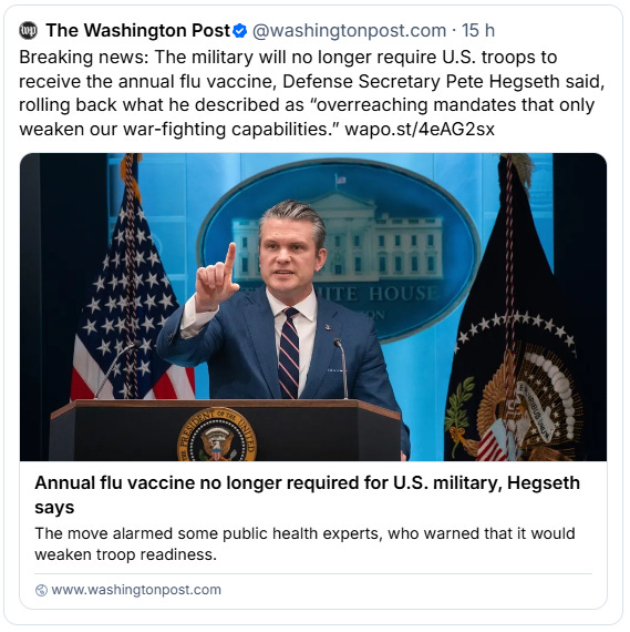 .- Last but not least: Los amados líderes al cargo han decidido que las tropas estadounidenses no serán vacunadas en lo sucesivo contra la gripe. Total, la epidemia de gripe generada en los EEUU y exportada a la vieja Europa por estas mismas tropas causó más víctimas durante la primera guerra mundial que la propia guerra. Pero la etiquetaron como “Spanish Flu” y a otro cosa. “History will teach nothing”. Save the day.