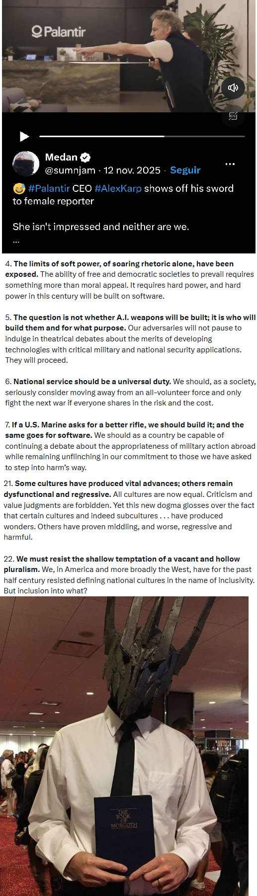 Como respuesta al punto 22 de ese tristemente famoso “Manifiesto de Palantir” nosotros incluiríamos el Manifiesto, a Palantir, y al cara panceta de Peter Thiel -y a su lugarteniente Lengua de Serpiente- en un cálido recodo del Monte del Destino. El del churrasco.