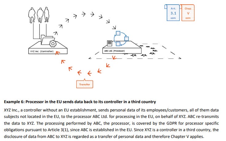 Last but not least.— As a closing note, and in addition to everything above, always remember the illustrative example from those EDPB guidelines about the interplay of Article 3 and Chapter V: if a company based in the EU acts as a processor for a non-European company, imports personal data, and returns them as part of a product or service, there is an international transfer in that return flow of the data to the non-EU controller.