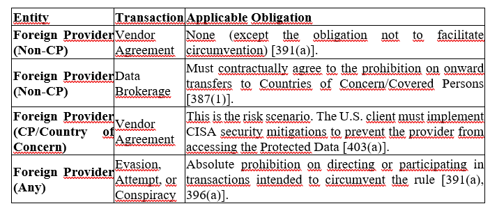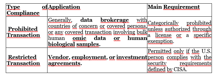 – If the following occur simultaneously: (i) the previous elements of a provider or employee from a restricted country (“Covered Person”), (ii) contracted by a U.S. entity (US Person), and (iii) with access to the covered data (“Covered Data”), then the scenario falls within the scope of compliance with this rule: a Covered Data Transaction.