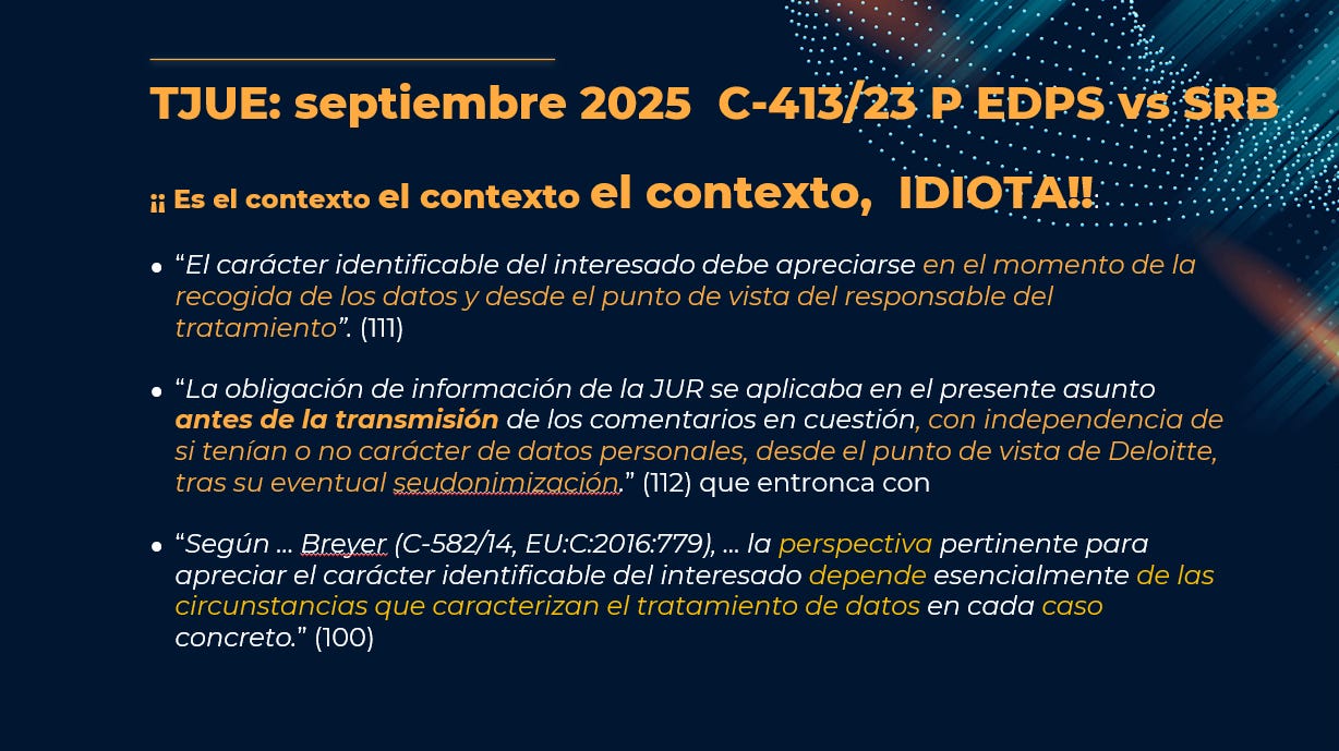 · Que el test de identificabilidad del dataset en manos del destinatario tiene que quedar documentado, no hace falta preguntárselo al TJUE.