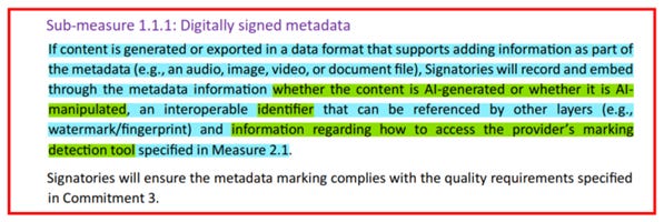[1] Strong words in the Code: “So long as no single marking approach is sufficient, under the state of the art, to comply with the four requirements in Article 50(2) AI Act of effectiveness, interoperability, robustness and reliability, Signatories will implement a multi-layered marking approach to ensure that the outputs of their generative AI systems are marked with at least two layers of machine-readable active marking, as specified in the sub-measures below” (p. 10).