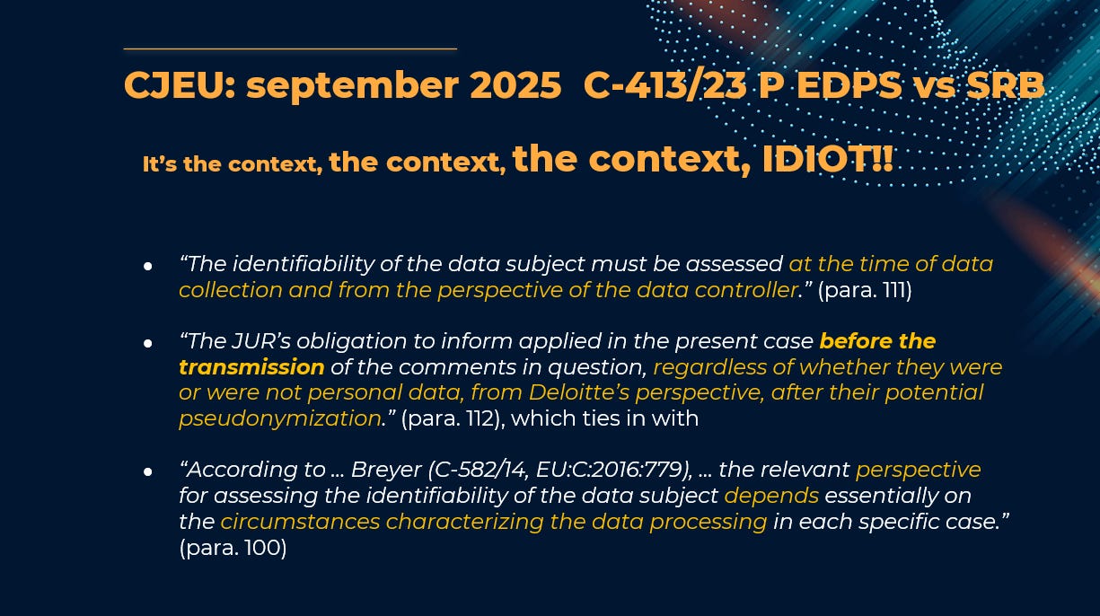 · That the test of identifiability of the dataset in the hands of the recipient has to be documented, you don’t have to ask the CJEU.